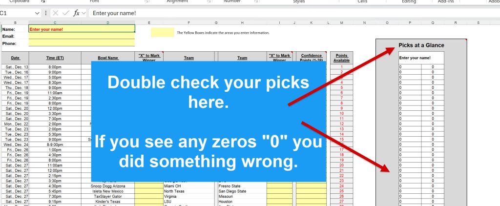 Double check your picks. If you see any zeros “0” in the “Picks at a Glance” area you did something wrong. Go back and make any necessary adjustments. Including making sure that there are no games with both teams picked or any unintentional spaces in any cells.